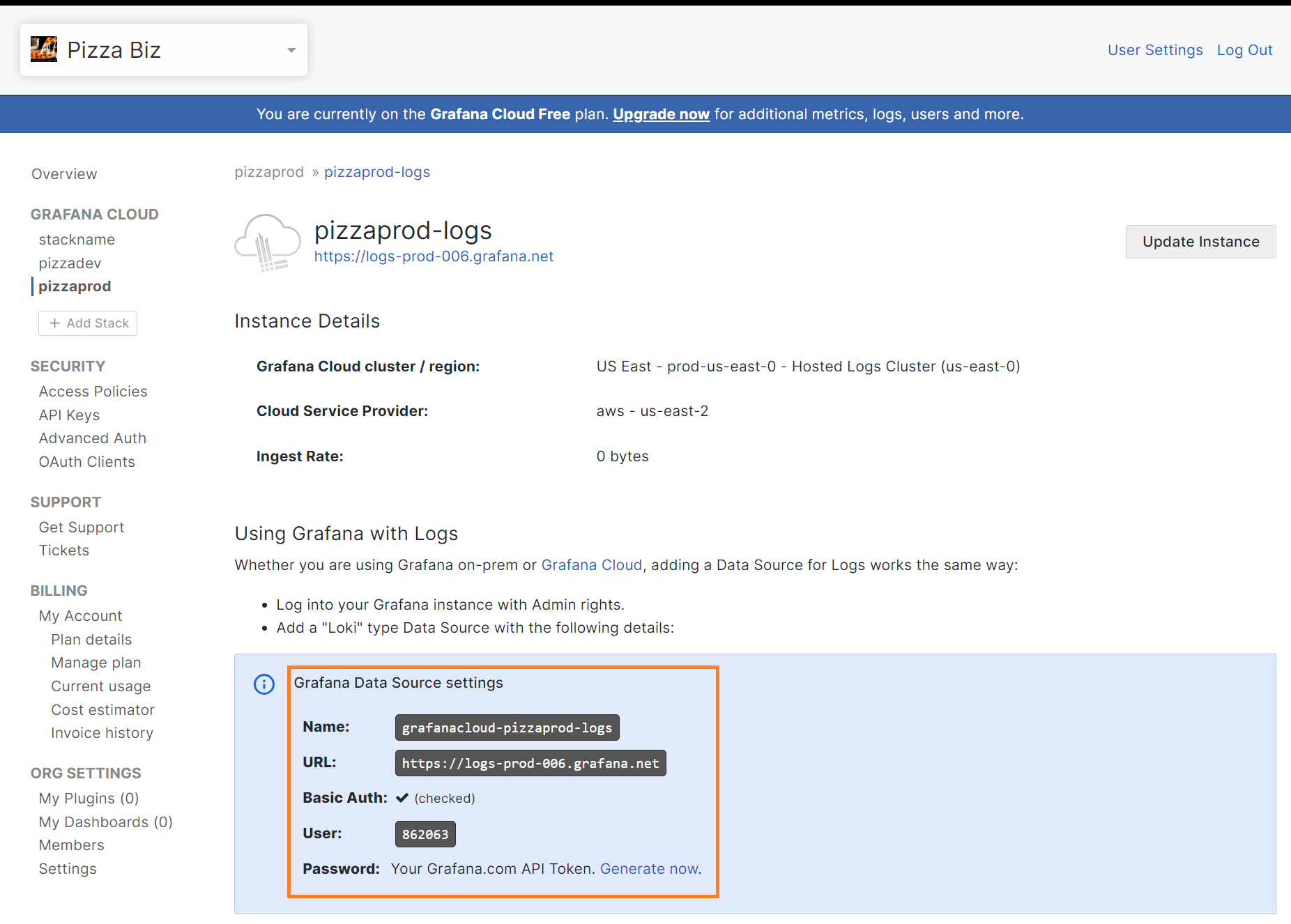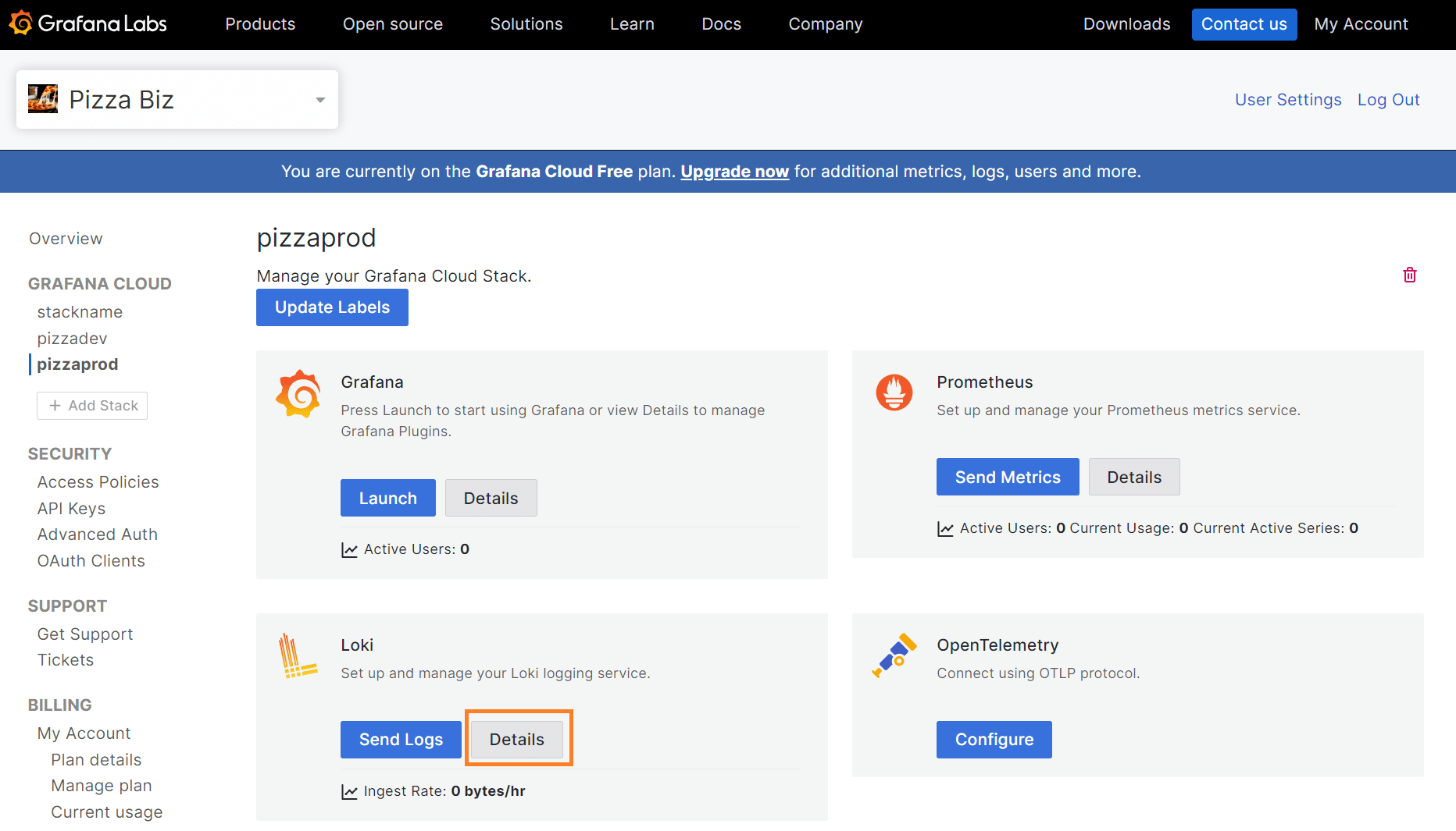 For example, to find the details needed to send logs to Grafana Cloud using Alloy select the stack name from the overview menu on the left, and then click on the Details button: