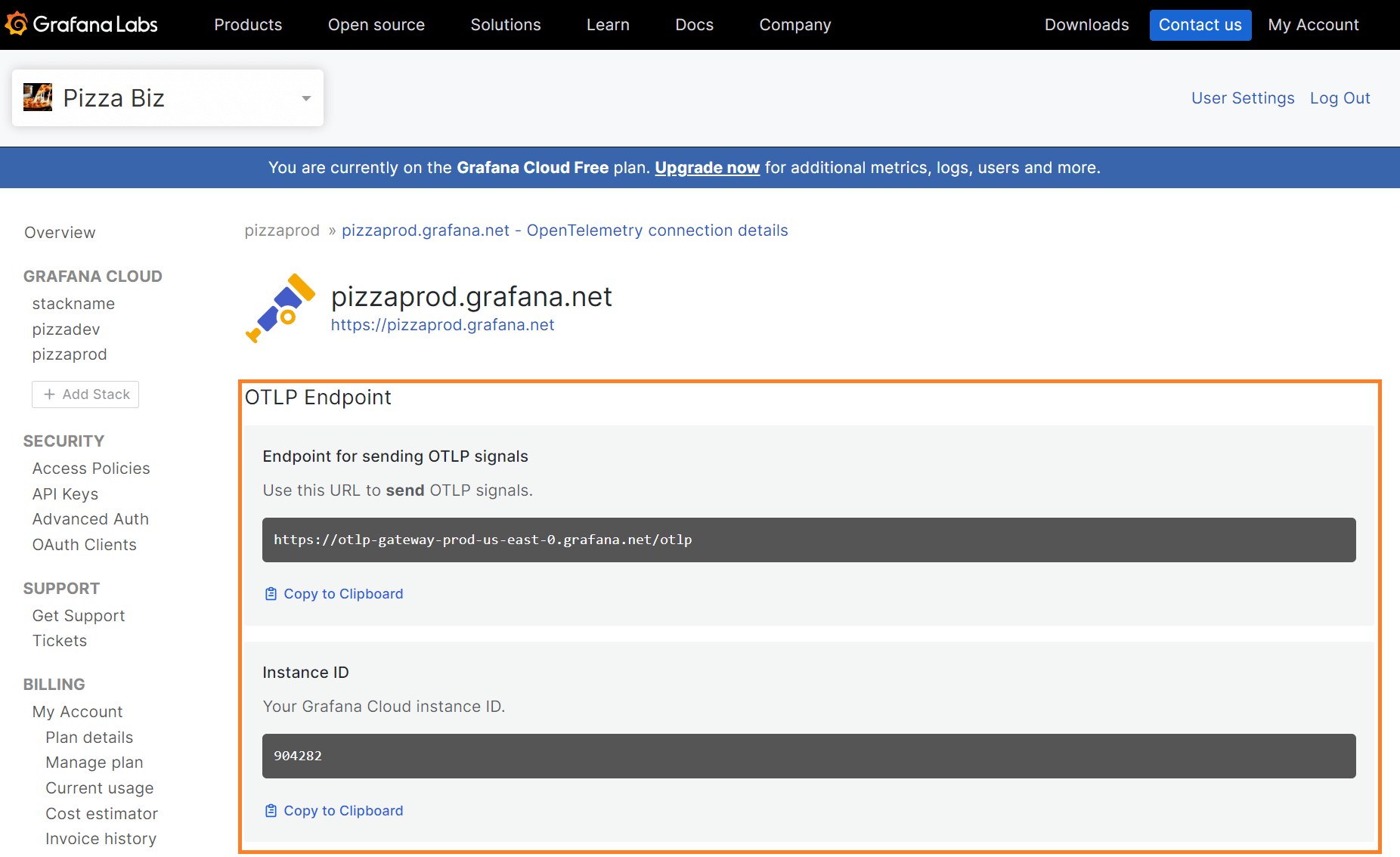 To locate the OpenTelemetry endpoint details, select the stack name from the overview menu on the left, then click on the Configure button and review the OTLP Endpoint information: