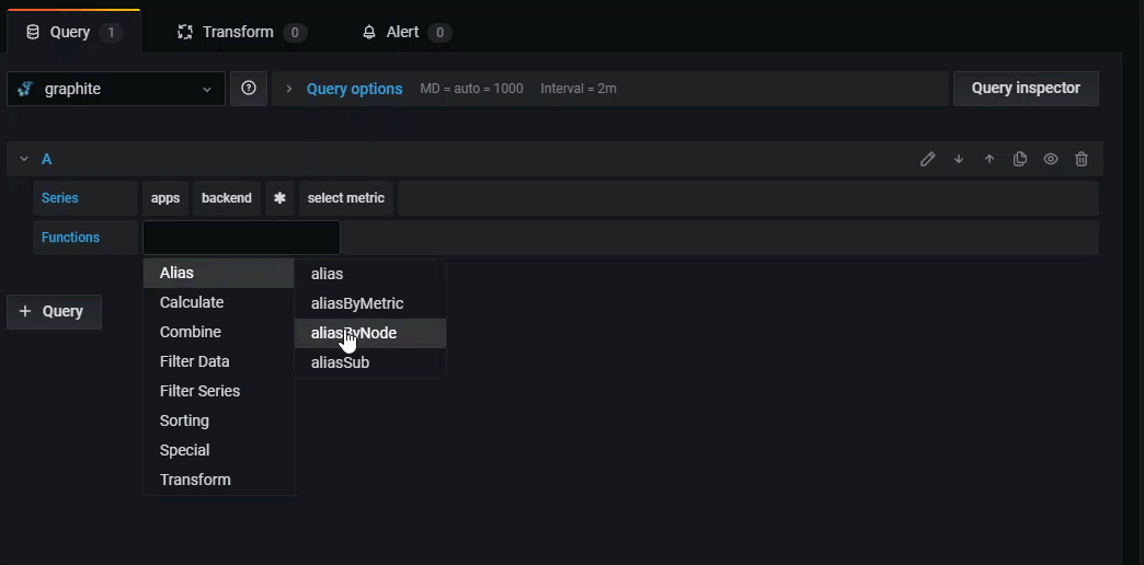 Functions - Graphite uses functions to manipulate data. Click the + sign to view a list of functions in the drop-down. You can create a query with multiple functions.