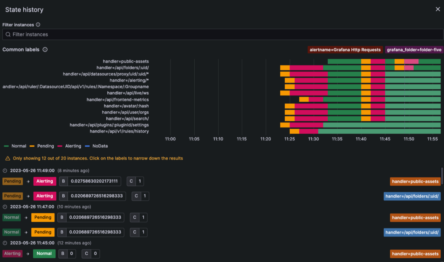 Use the improved State history view to get insight into how your alert instances behave over time. View information on when a state change occurred, what the previous state was, the current state, any other alert instances that changed their state at the same time, as well as what the query value was that triggered the change.