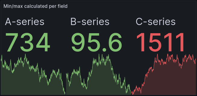 In this example in the stat visualization, it’s hard to get an idea of how the values of each series relate to the historical values of that series. The threshold of 10% is exceeded by the A-series even though the A-series is below 10% of its historical maximum.