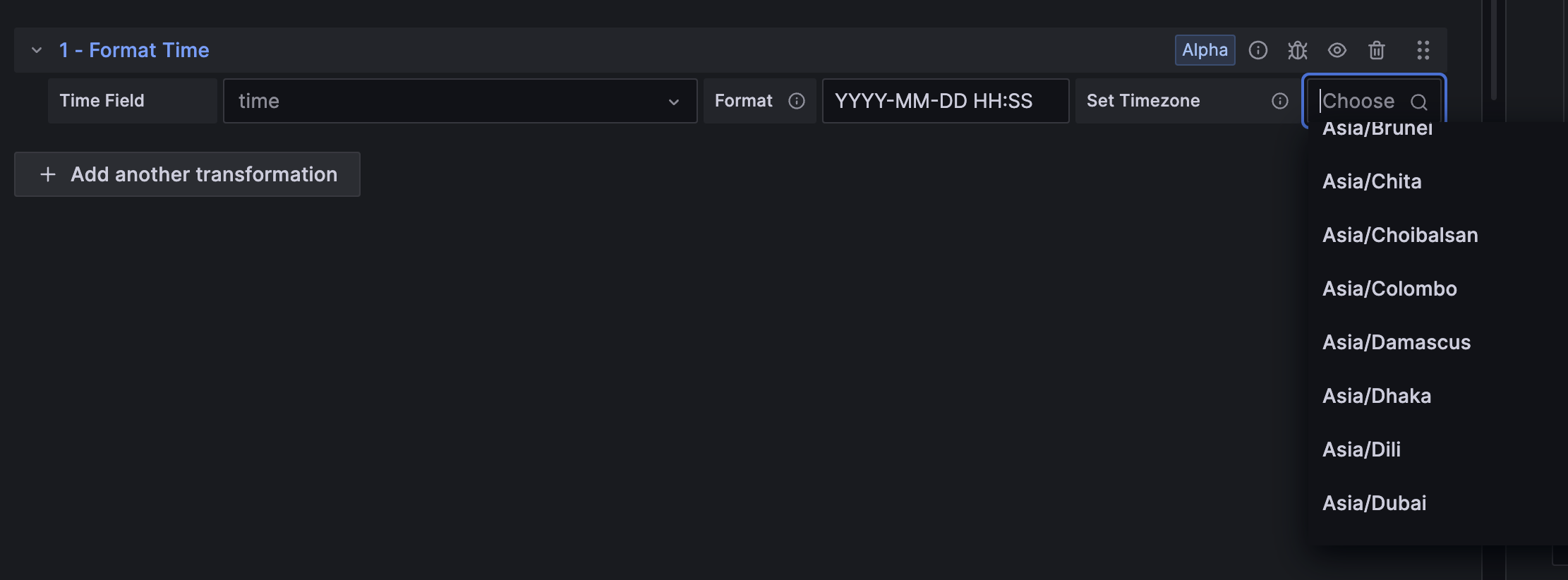 We’ve added support for setting timezones manually when formatting times as strings using the Format time and Convert field type transformations. This allows times to be formatted relative to any timezone across the globe.