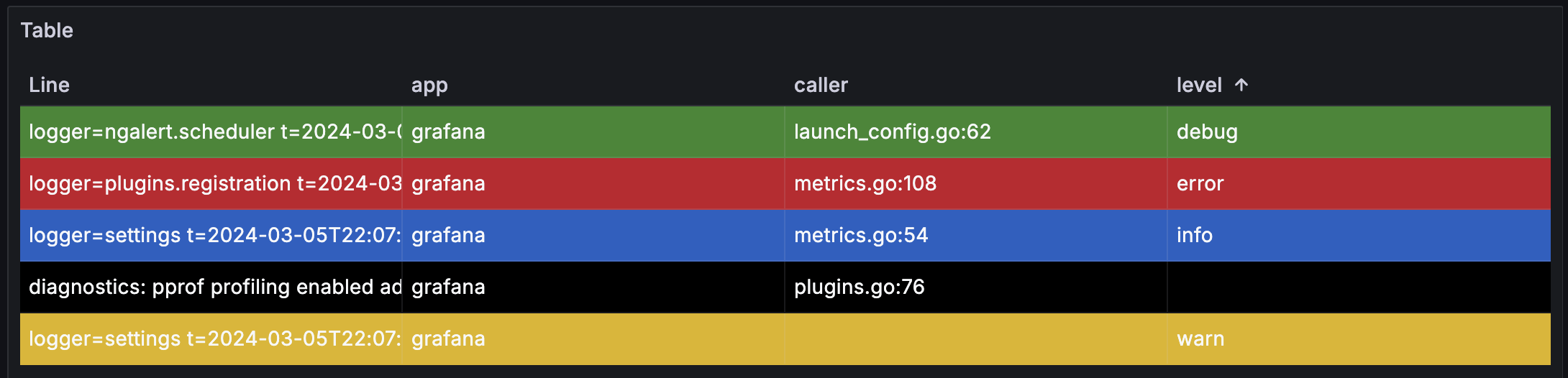 This feature is useful for a wide variety of use cases including mapping status fields to colors (for example, info, debug, warning) and allowing rows to be colored based on threshold values. This is one of the first steps in making formatting tables more seamless, and allows for quick scanning of data using the table visualization.