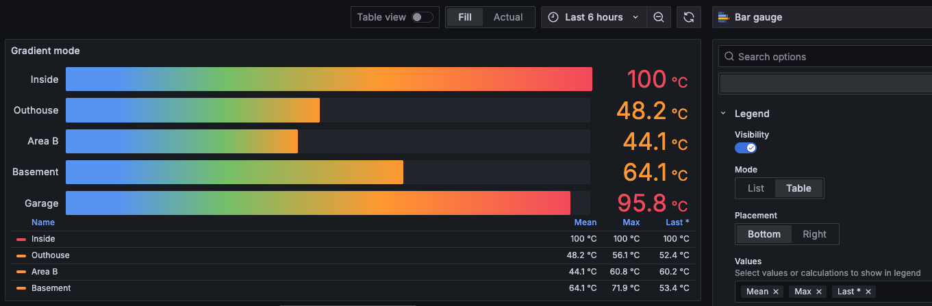 You can also hide names in each bar gauge, since they are redundant to the legend. To do that, in the Name placement option, choose Hidden.