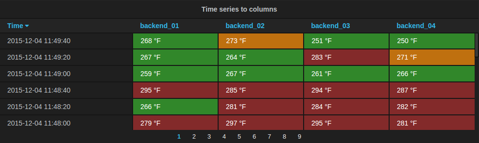 The new table panel is very flexible, supporting both multiple modes for time series as well as for table, annotation and raw JSON data. It also provides date formatting and value formatting and coloring options.