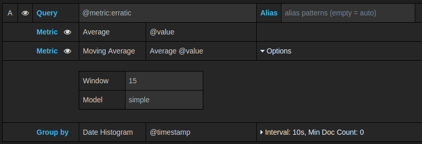 If you have Elasticsearch 2.x and Grafana 2.6 or above then you can use pipeline metric aggregations like Moving Average and Derivative. Elasticsearch pipeline metrics require another metric to be based on. Use the eye icon next to the metric to hide metrics from appearing in the graph.