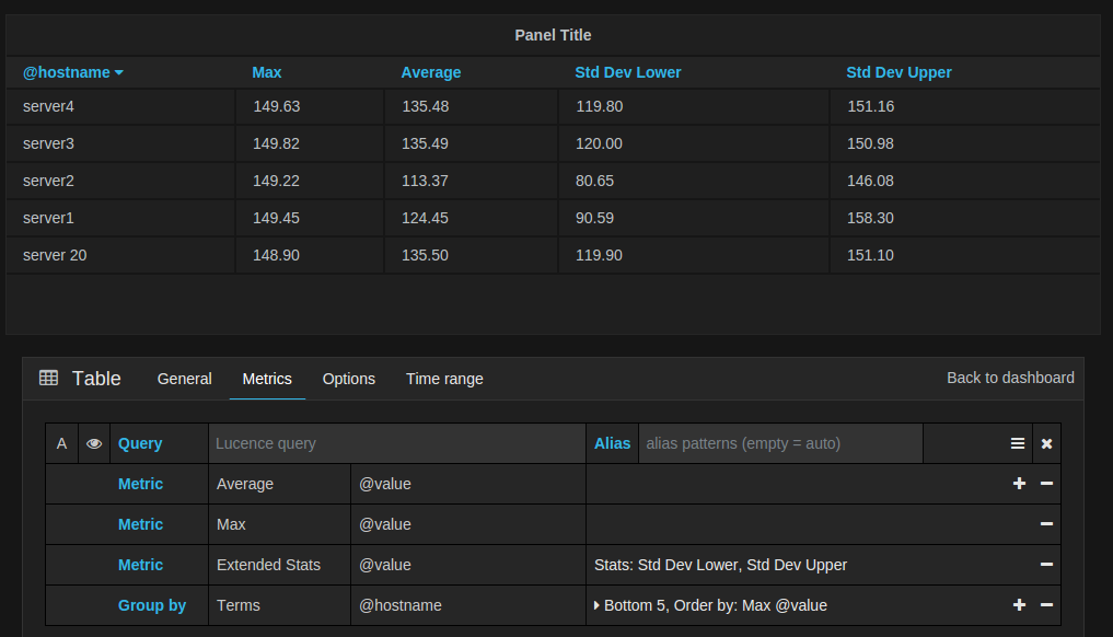 You can also make Elasticsearch aggregation queries without a Date Histogram. This allows you to use Elasticsearch metric aggregations to get accurate aggregations for the selected time range.