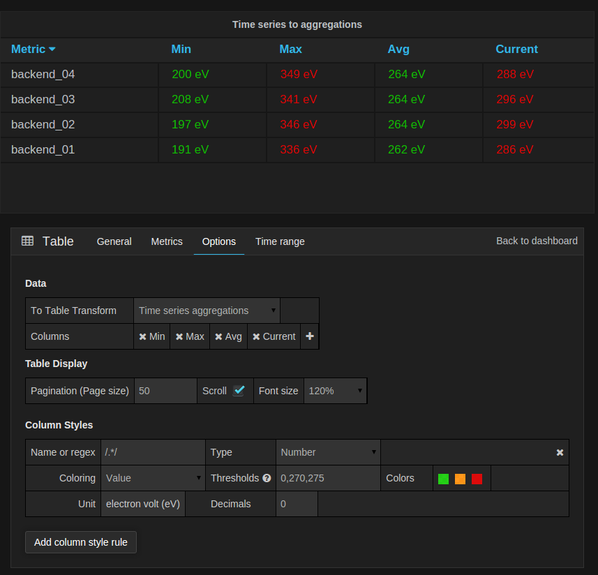 In the screenshot above you can see how the same time series query as in the previous example can be transformed into a different table by changing the To Table Transform to Time series to columns.