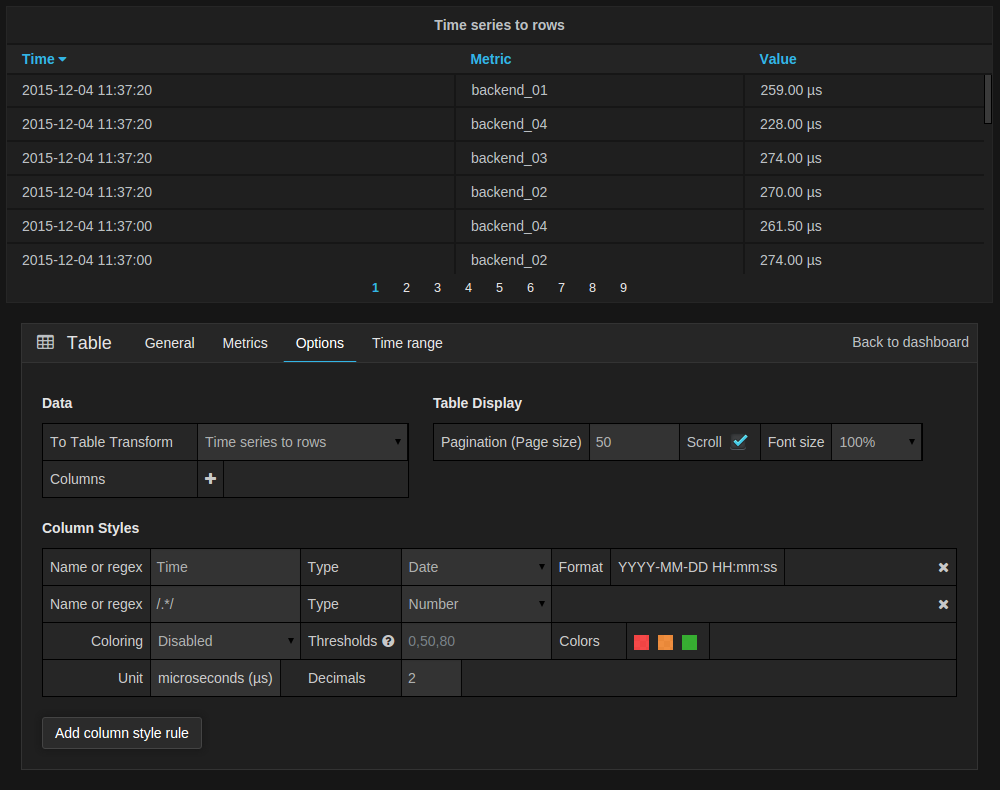 Above you see the options tab for the Table Panel. The most important option is the To Table Transform. This option controls how the result of the metric/data query is turned into a table.