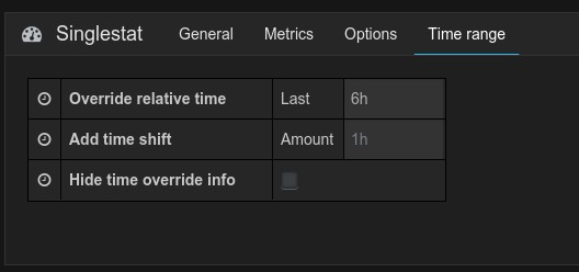 In Grafana v2.x you can now override the relative time range for individual panels, causing them to be different than what is selected in the Dashboard time picker in the upper right. You can also add a time shift to individual panels. This allows you to show metrics from different time periods or days at the same time.