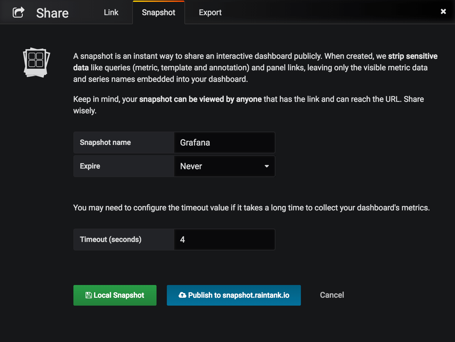 You can publish snapshots to you local instance or to snapshot.raintank.io. The later is a free service that is provided by Raintank that allows you to publish dashboard snapshots to an external grafana instance. The same rules still apply, anyone with the link can view it. You can set an expiration time if you want the snapshot to be removed after a certain time period.