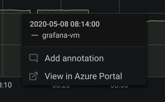 Click on a time series in the panel to see a context menu with a link to View in Azure Portal. Clicking that link opens the Azure Log Analytics query editor in the Azure Portal and runs the query from the Grafana panel there.
