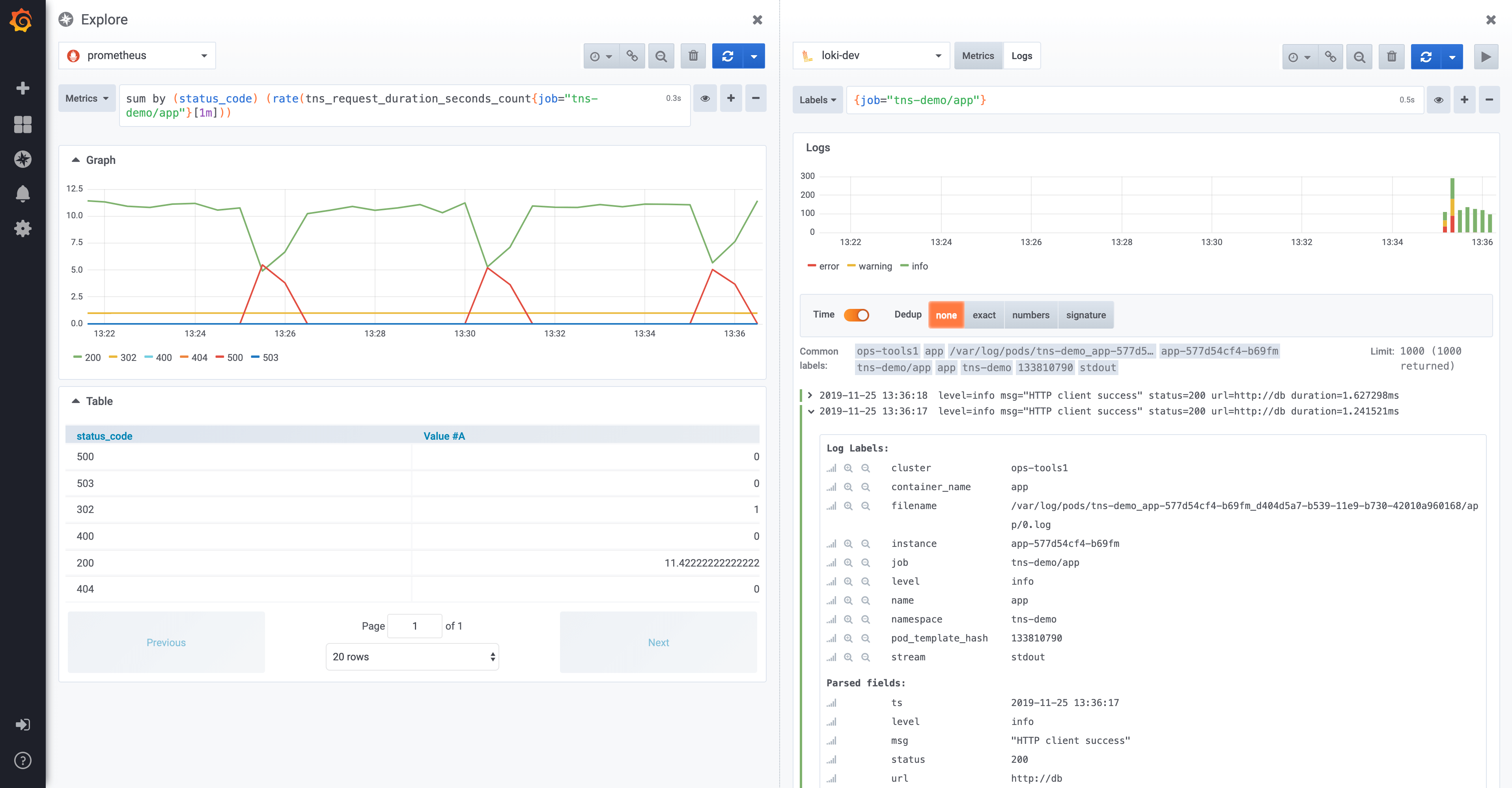 For infrastructure monitoring and incident response, you no longer need to switch to other tools to debug what went wrong. Explore allows you to dig deeper into your metrics and logs to find the cause. Grafana’s new logging data source, Loki is tightly integrated into Explore and allows you to correlate metrics and logs by viewing them side-by-side. This creates a new debugging workflow where you can: