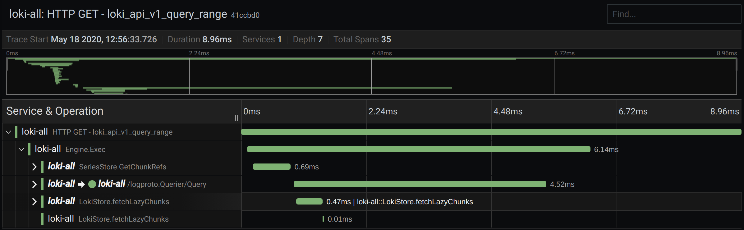 Shows condensed view or the trace timeline. Drag your mouse over the minimap to zoom into smaller time range. Zooming will also update the main timeline, so it is easy to see shorter spans. Hovering over the minimap, when zoomed, will show Reset Selection button which resets the zoom.