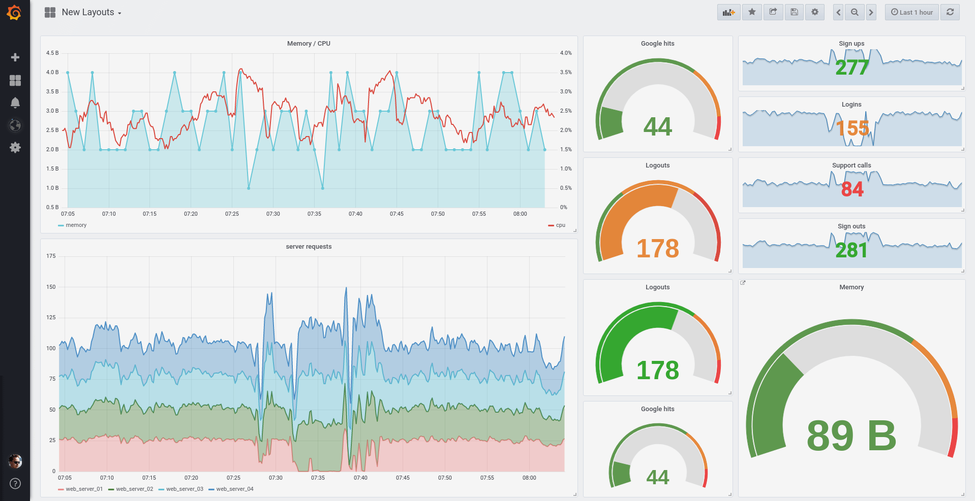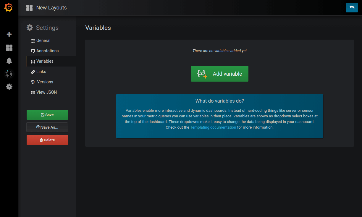 The new dashboard layout engine allows for much easier movement and sizing of panels, as other panels now move out of the way in a very intuitive way. Panels are sized independently, so rows are no longer necessary to create layouts. This opens up many new types of layouts where panels of different heights can be aligned easily. Check out the new grid in the video above or on the play site. All your existing dashboards will automatically migrate to the new position system and look close to identical. The new panel position makes dashboards saved in v5.0 incompatible with older versions of Grafana.