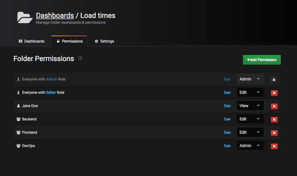 - Permissions on folders and dashboards helps manage larger Grafana installations.