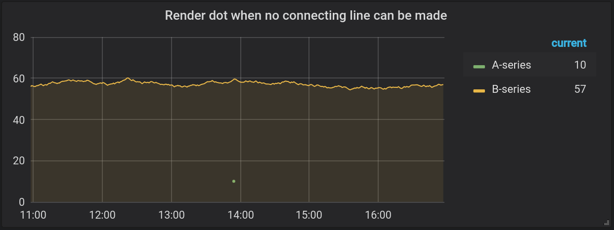 Additionally, when rendering series as lines in the graph panel, should there be only one data point available for one series so that a connecting line cannot be established, a point will automatically be rendered for that data point. This should make it easier to understand what’s going on when only receiving a single data point.