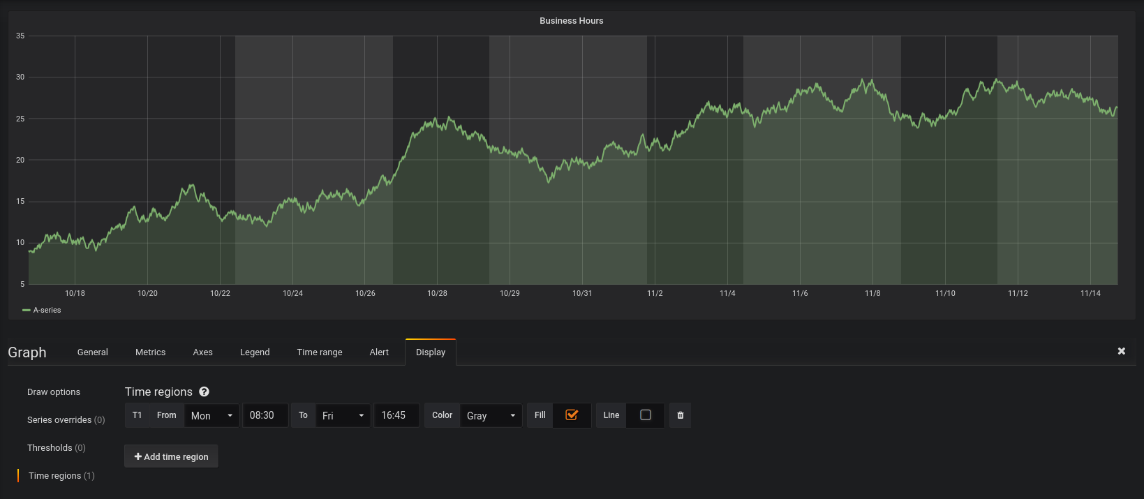 Grafana v5.4 adds support for highlighting weekdays and/or certain timespans in the graph panel. This should make it easier to compare for example weekends, business hours and/or off work hours.