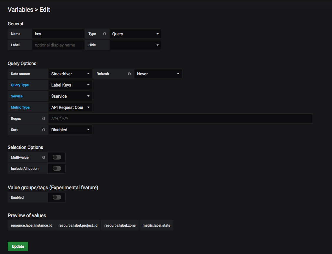 The Stackdriver templating query editor lets you choose from a set of different Query Types. This will in turn reveal additional drop-downs to help you find, filter and select the templating values you’re interested in, see screenshot for details. The templating query editor also supports chaining multiple variables making it easy to define variables that’s dependent on other variables.