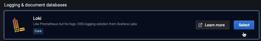 Search for a specific data source by entering the name in the search dialog. Or you can scroll through supported data sources grouped into time series, logging, tracing and other categories.