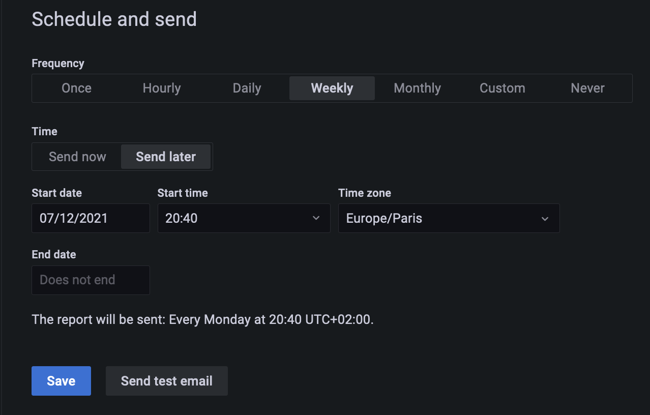 Send now sends the report immediately after you save it. To stop sending the report at some point in the future, add an end date. If you leave the end date empty, the report is sent out indefinitely.