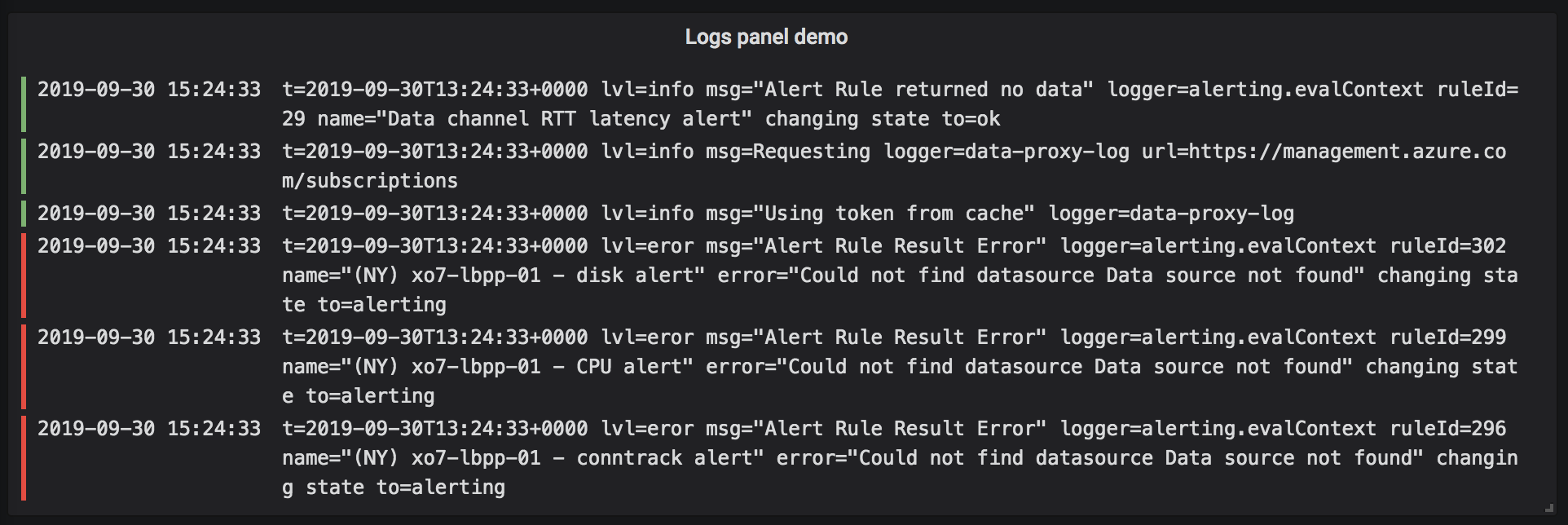 The logs visualization shows the result of queries that were entered in the Query tab. The results of multiple queries are merged and sorted by time. You can scroll inside the panel if the data source returns more lines than can be displayed at any one time.