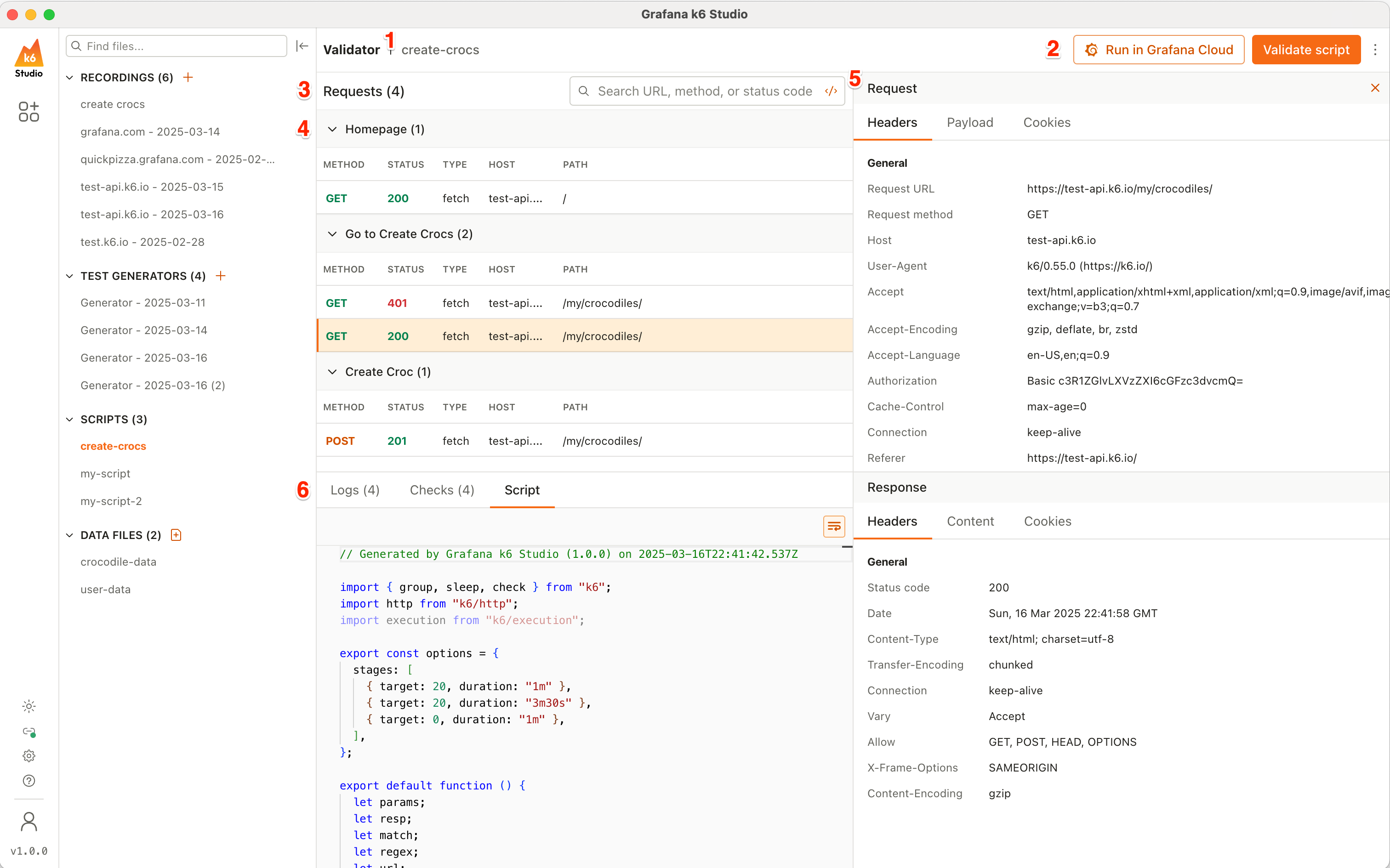 The Validator can help you validate that a test script is working as expected. You can use it to run one iteration of your test, and visualize the request and response of any requests on your test script, as well as checks and logs. The Validator works with any k6 test script, not only scripts generated in k6 Studio.