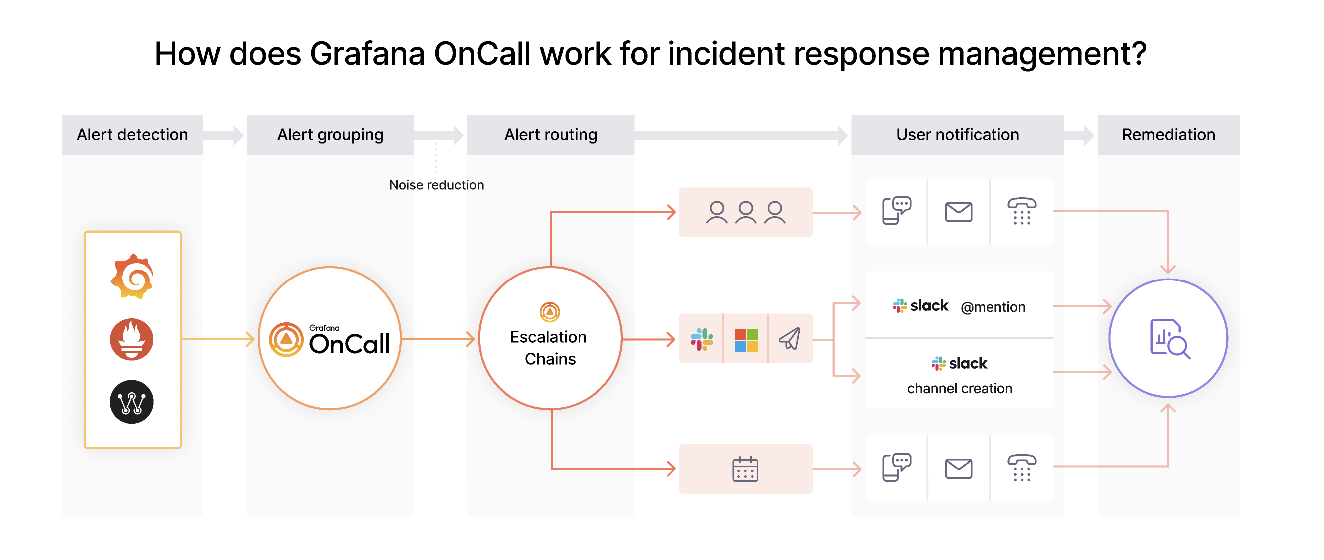 Grafana OnCall was built to help DevOps and SRE teams improve their on-call management process and resolve incidents faster. With OnCall, users can create and manage on-call schedules, automate escalations, and monitor incident response from a central view, right within the Grafana UI. Teams no longer have to manage separate alerts from Grafana, Prometheus, and Alertmanager, lowering the risk of missing an important update and limiting the time spent receiving and responding to notifications.