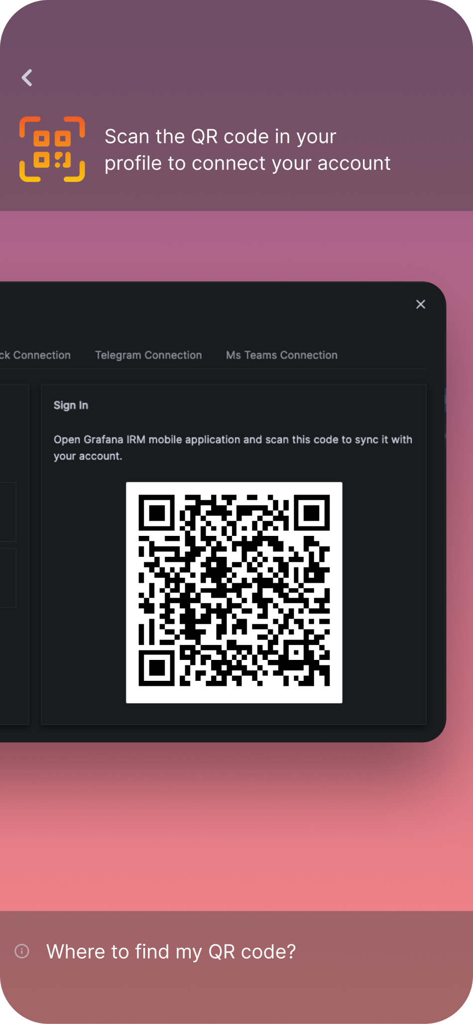 Another way to connect your Grafana OnCall account to the mobile app is by using a QR code authentication.