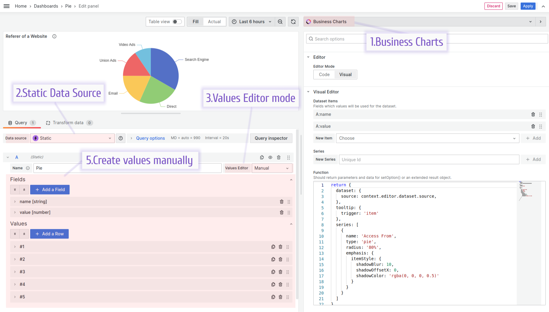 You can use the Business Charts demo project to play with both the Business Input data source settings and the Business Charts parameters following the link Business Charts Pie examples. Go to Edit mode and start experimenting.