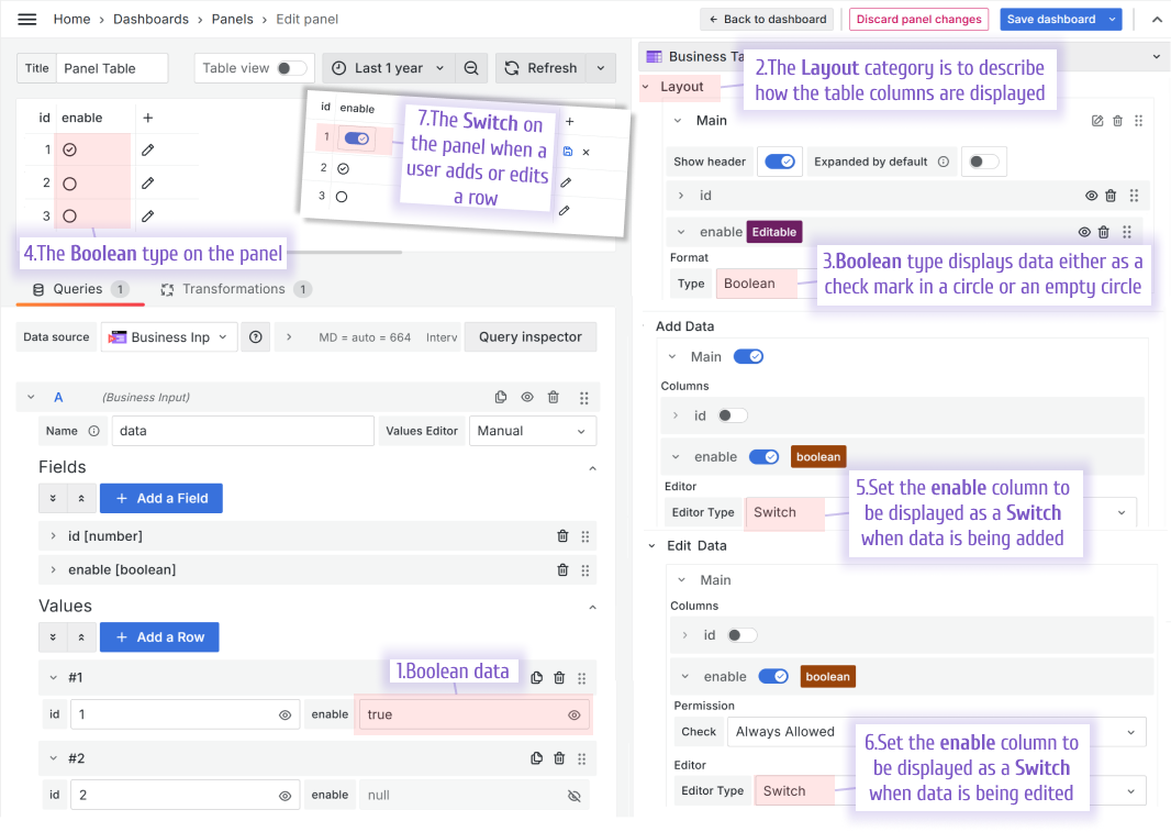 The Switch editor type makes working with the Business Table panel more intuitive by transforming boolean data into a switch that you can turn on and off.