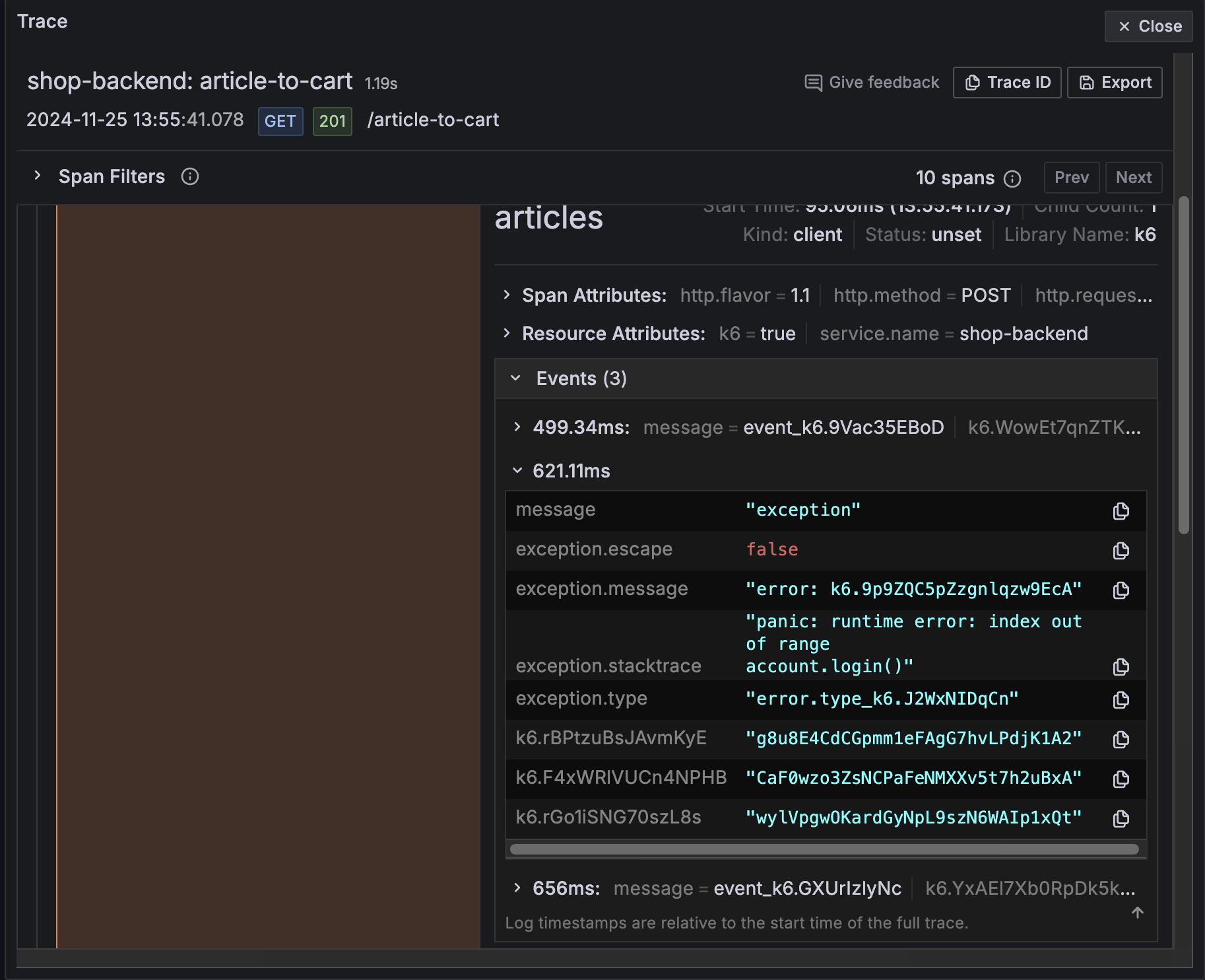 Drilling into the shop-backend span, you can see that the place-articles operation has an exception event tied to it. This is likely the root cause of the slow trace.
