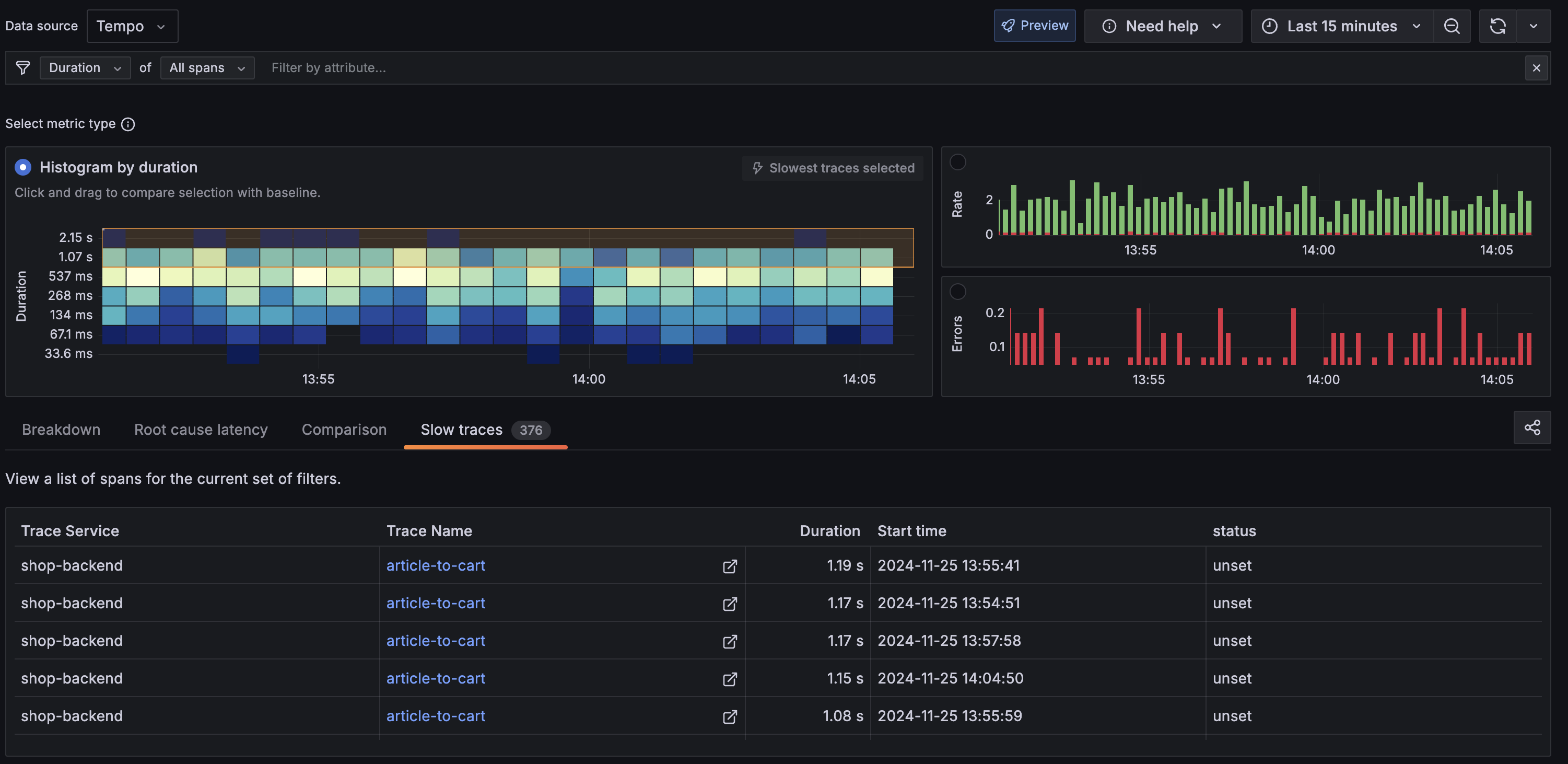 - Within the filter bar, there is a dropdown menu set to Rate of Full traces. Change this to Duration and All spans.