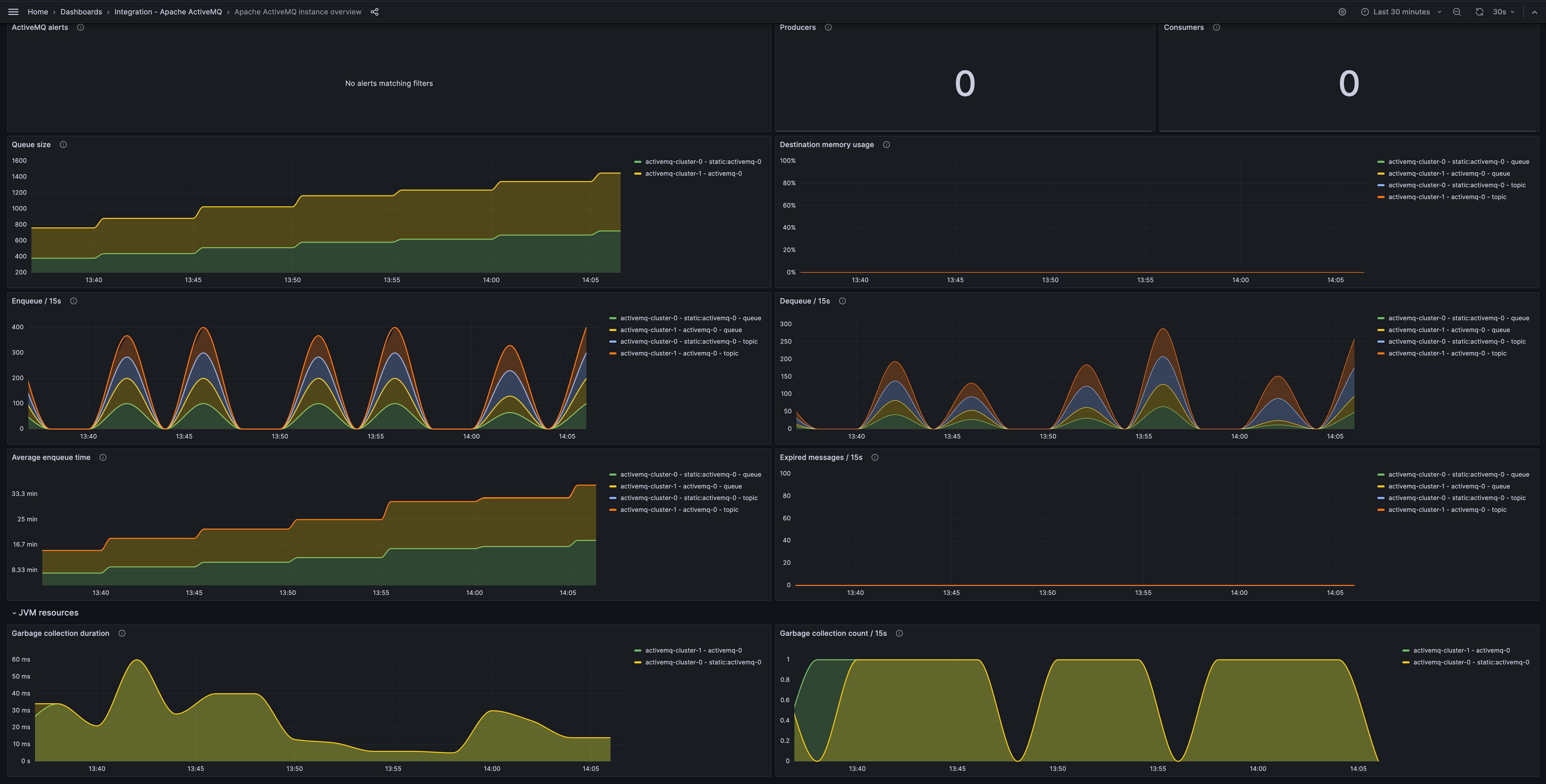 Apache ActiveMQクラスター概要のプリビルトGrafanaダッシュボードのスクリーンショット