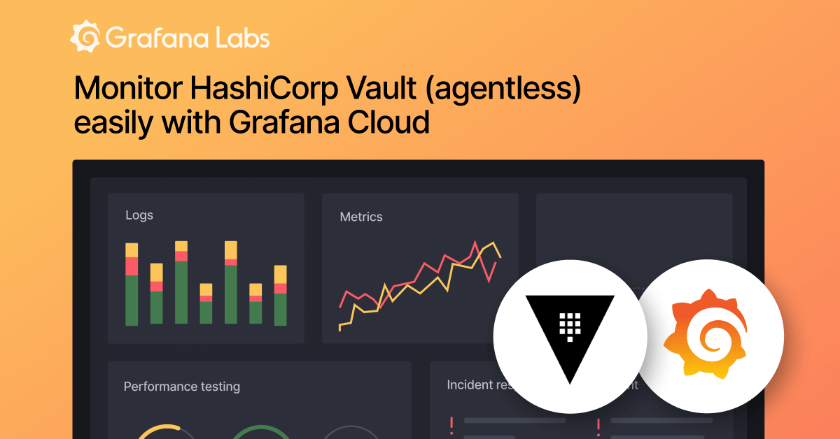 VaultとGrafana Labsのロゴ、背景のダッシュボード、および「Grafana CloudでHashiCorp Vault(エージェントレス)を簡単に監視」というコピーが描かれたイラスト