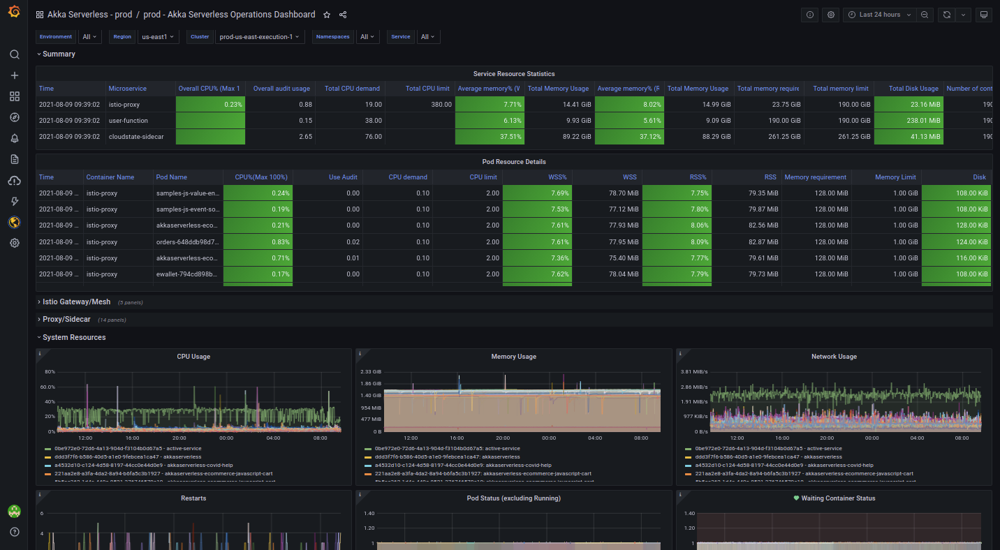 The dashboard below is used by Lightbend’s Akka Serverless and operations teams and it’s a real time-saver. “Basically, if I have any issue, I can come here and see what’s going on without having to access Kubernetes or log into the system,” Costa says. “We can see all production deployments, all the containers, everything that’s running. I can also select by namespace and see how the requests are running, or check data from a sidecar.”