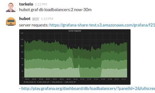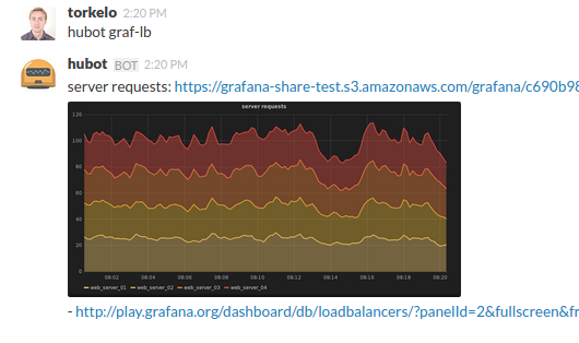 This guide shows you how to install and configure the Hubot-Grafana plugin. This plugin allows you to tell Hubot to render any dashboard or graph right from a channel in Slack, Basecamp, or any other supported Hubot adapter. The bot will respond with an image of the graph and a link that will take you to the graph.