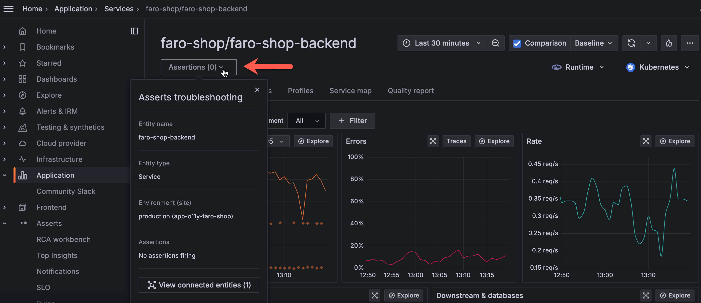 Asserts now supports root cause analysis bi-directional navigation between Asserts and Grafana Application Observability and Kubernetes Monitoring. When you are in Application Observability or Kubernetes Monitoring, you can seamlessly explore Assertions in Asserts without losing context. When in Asserts, you can easily navigate to Application Observability or Kubernetes Monitoring.