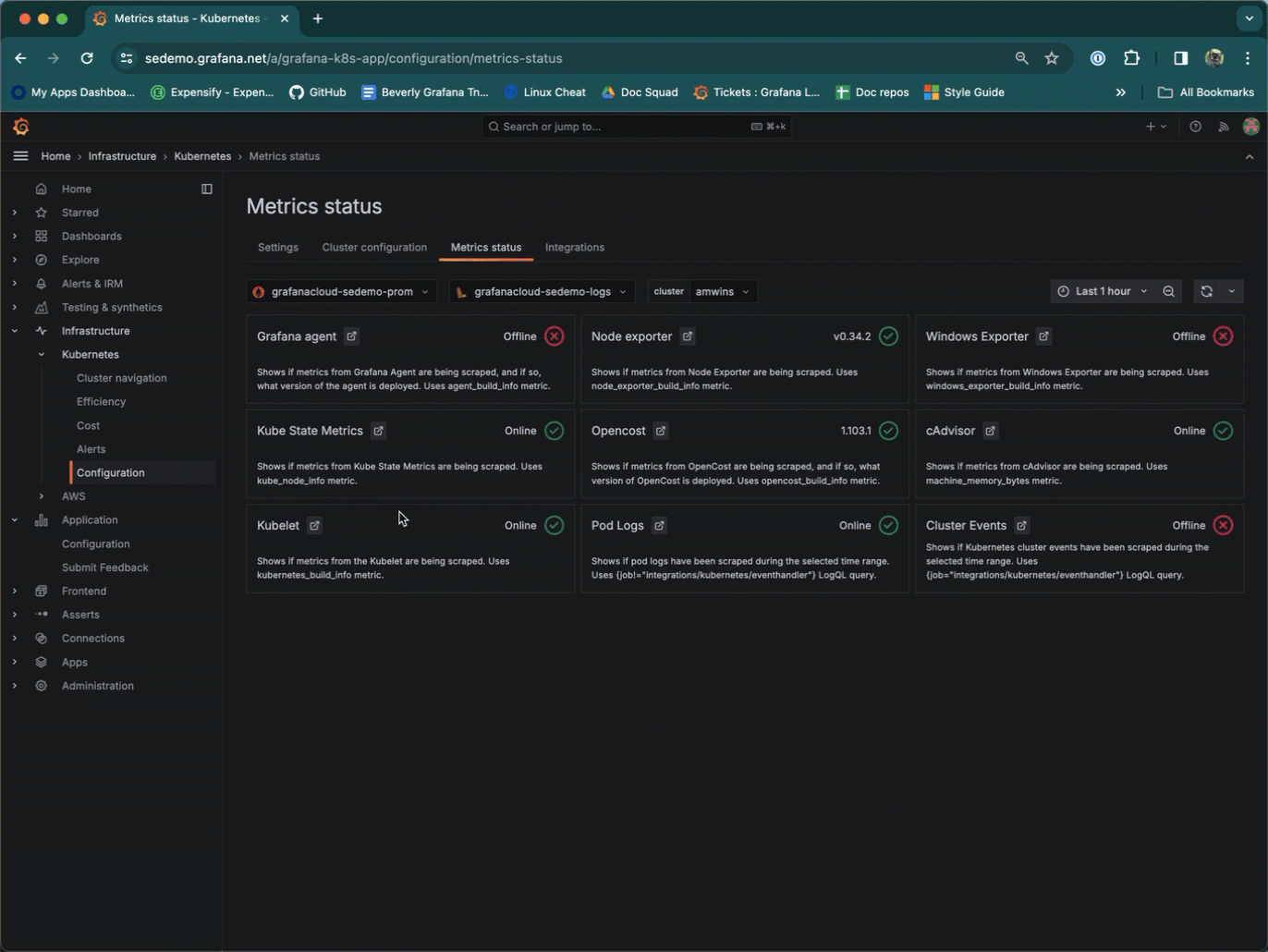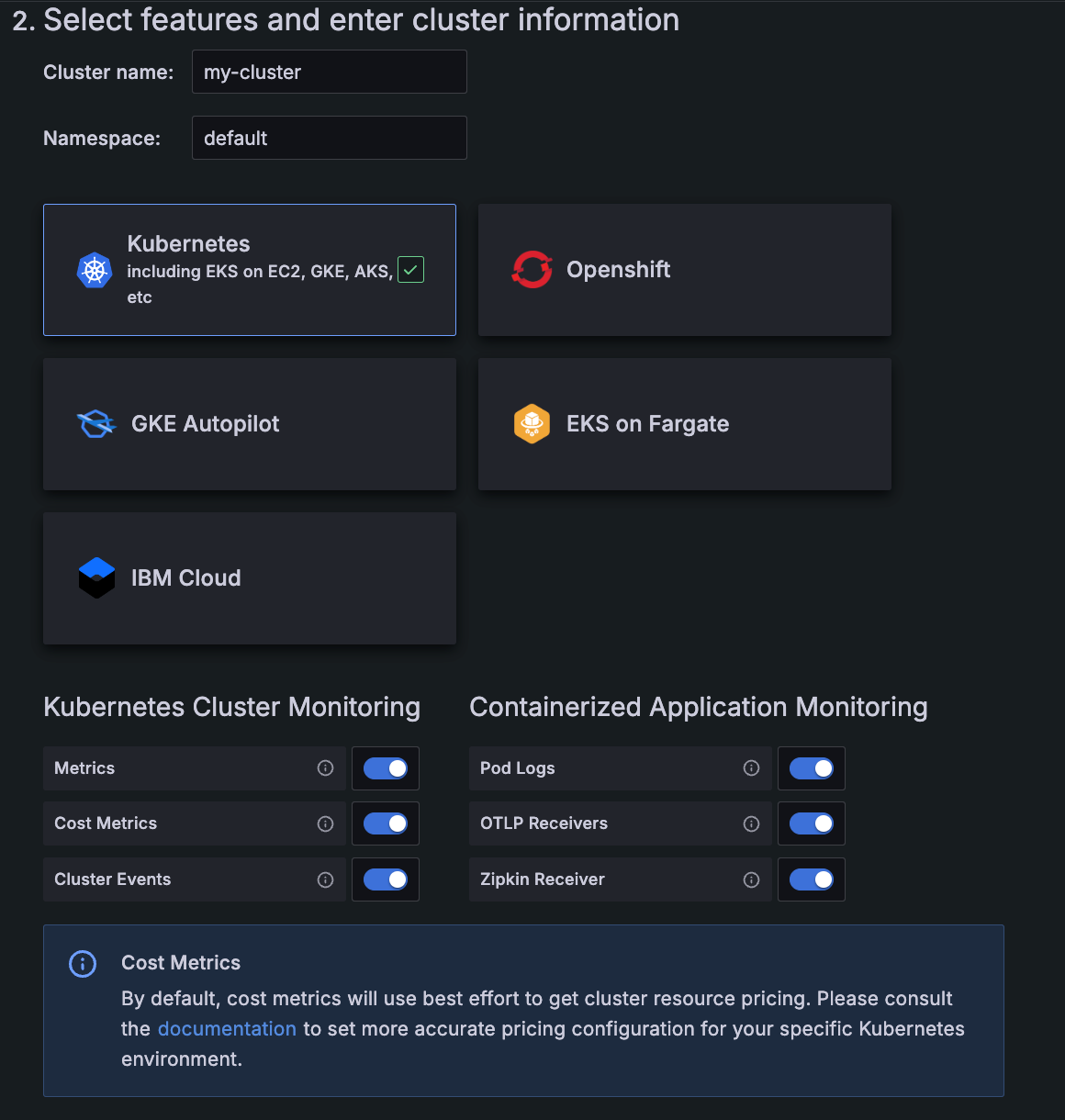 When you use the easy configuration process with Grafana Kubernetes Monitoring Helm chart, you can switch on the use of OTLP and Zipkin receivers for containerized application monitoring.