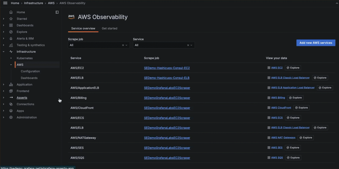 It’s hard to diagnose and resolve issues when your observability data is dispersed across many systems, which can lead to longer times to troubleshoot. Grafana’s AWS Observability provides a centralized location to work with critical observability data so you can fully understand the state of your systems. You can: