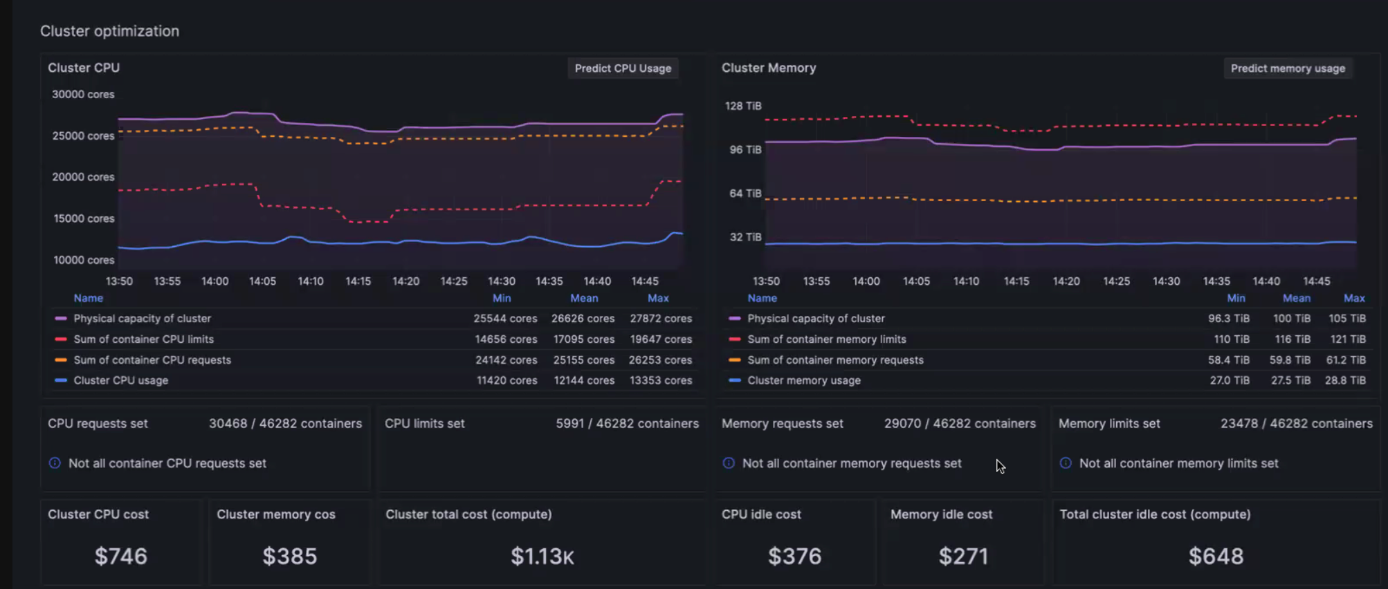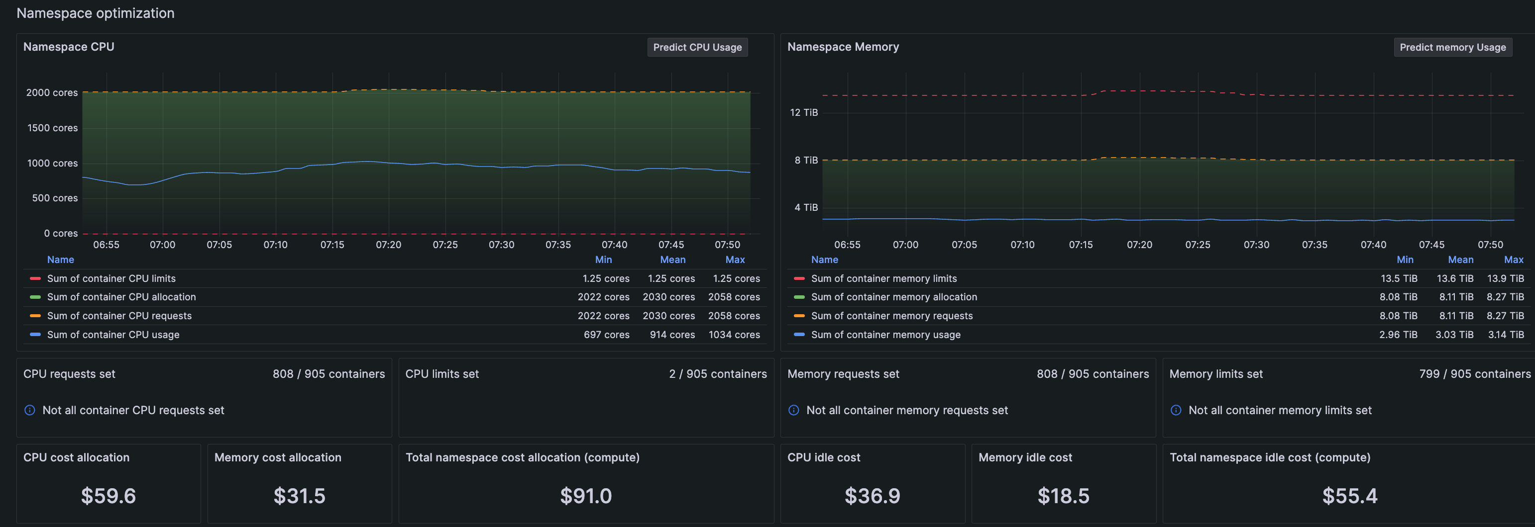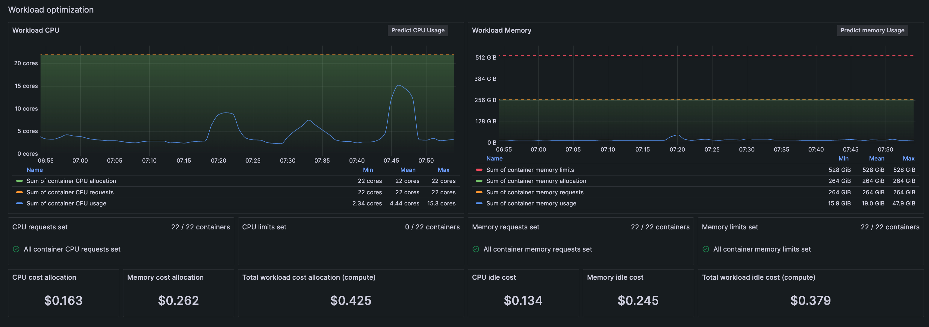 CPU and memory usage graphs and details, along with associated costs, are available on these pages in Kubernetes Monitoring: