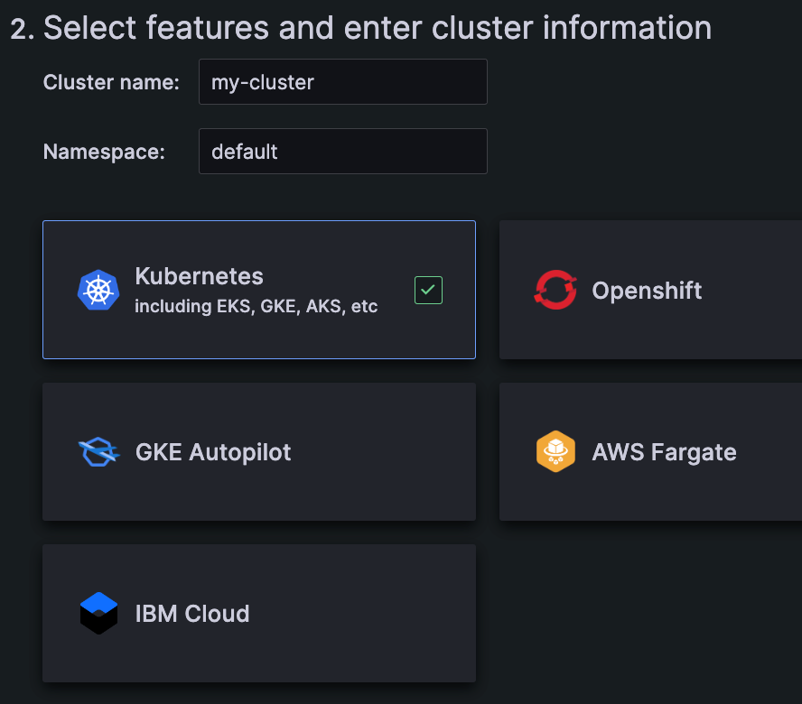 When configuring Kubernetes Monitoring with the streamlined configuration wizard that uses Grafana Kubernetes Helm Chart, you can select the platform you are using.